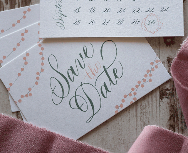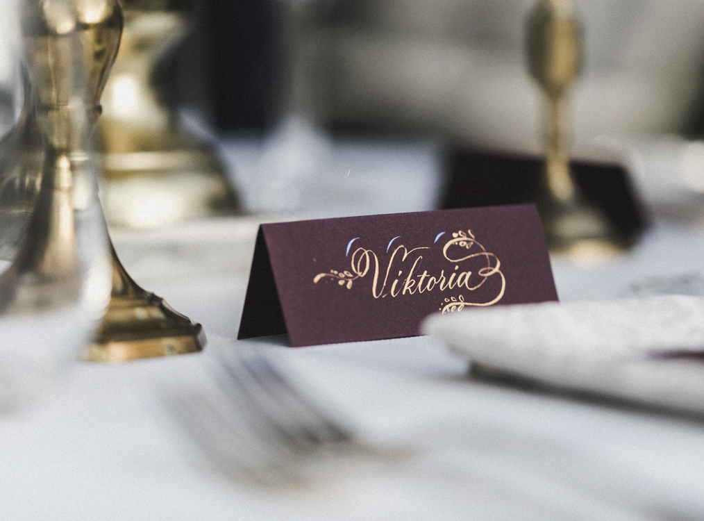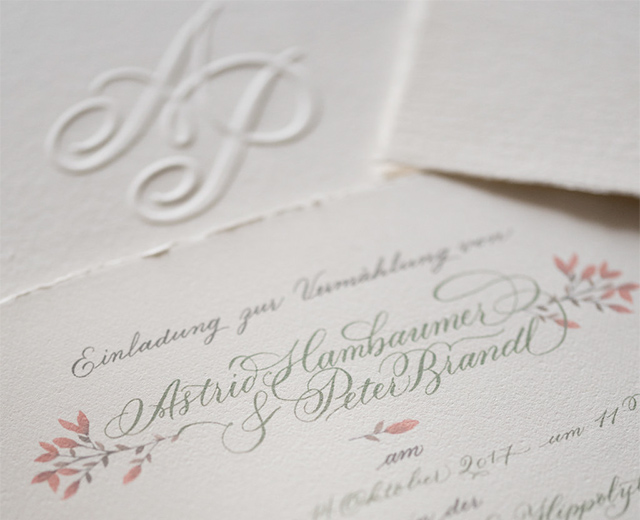 - Handkalligraphierte Details (z.B. Namen auf Einladung, Tischkärtchen, Umschlagbeschriftung)