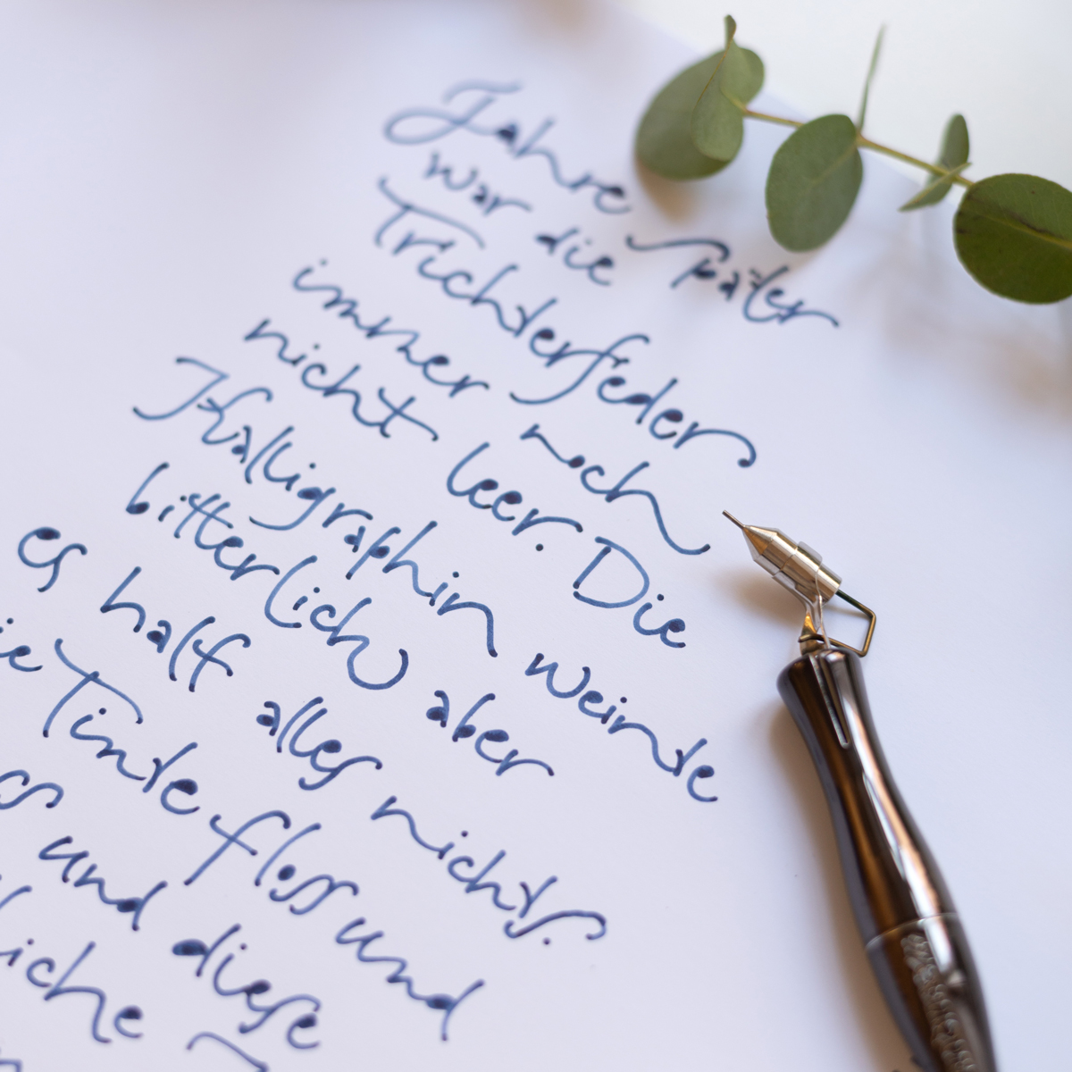In diesem Seminar dreht sich alles darum, ein modernes Alphabet mit der Spitzfeder zu erlernen. Schritt für Schritt üben wir gemeinsam, wie sich mit diesem Werkzeug ausdrucksstarke Buchstaben gestalten lassen. Du lernst, wie du die Feder gezielt einsetzen kannst, um ein zeitgemäßes Alphabet mit charakteristischen Kontrasten zu schreiben. Dünne und kräftige Striche entstehen durch den bewussten Einsatz von Druck – genau dieses Spiel mit der Strichstärke verleiht dem modernen Schriftbild seine Lebendigkeit.