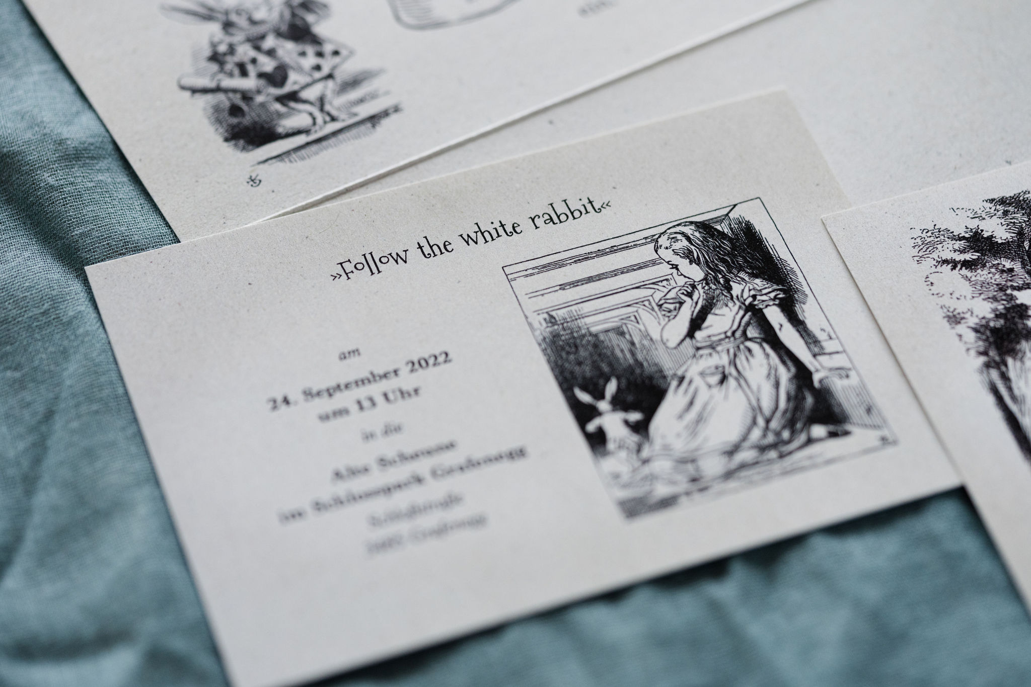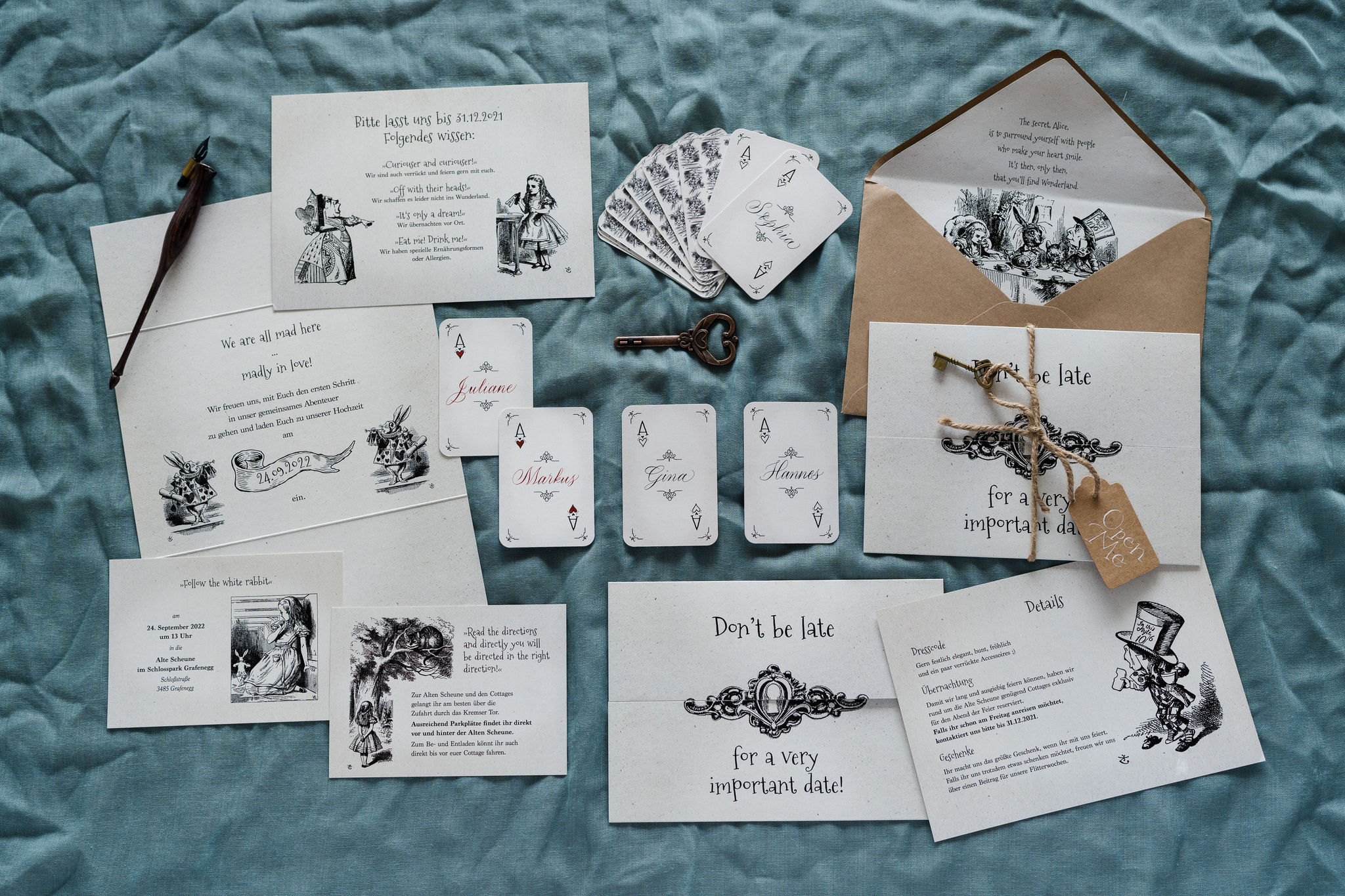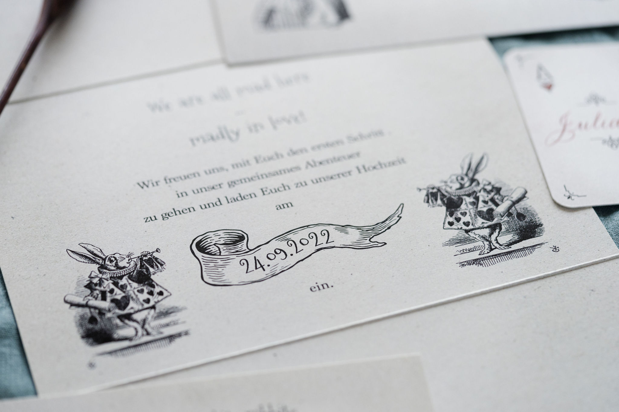Diese Hochzeit war von vorne bis hinten wundervoll durchgeplant. Das Brautpaar hatte sich als Thema „Alice im Wunderland“ ausgesucht und keine Kosten und Mühen gescheut um das Thema möglichst detailreich umzusetzen. Von der Deko bis zur Kleidung war jedes Detail im Wunderland-Stil. Somit musste natürlich auch die Papeterie dazu passen. Das Brautpaar hatte den Wunsch, die Illustrationen aus dem Originalwerk von Alice im Wunderland zu verwenden und die Papeterie an diese Illustrationen anzupassen.