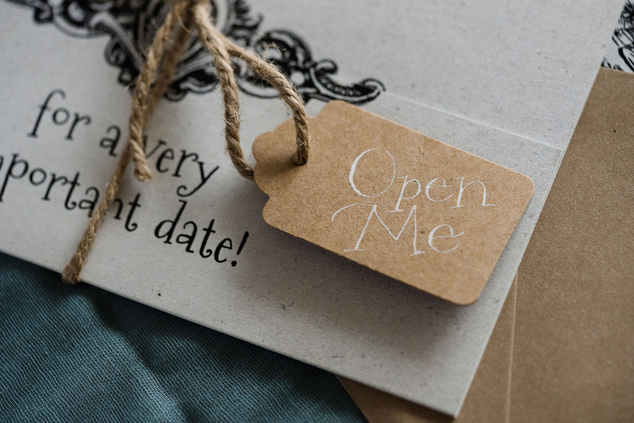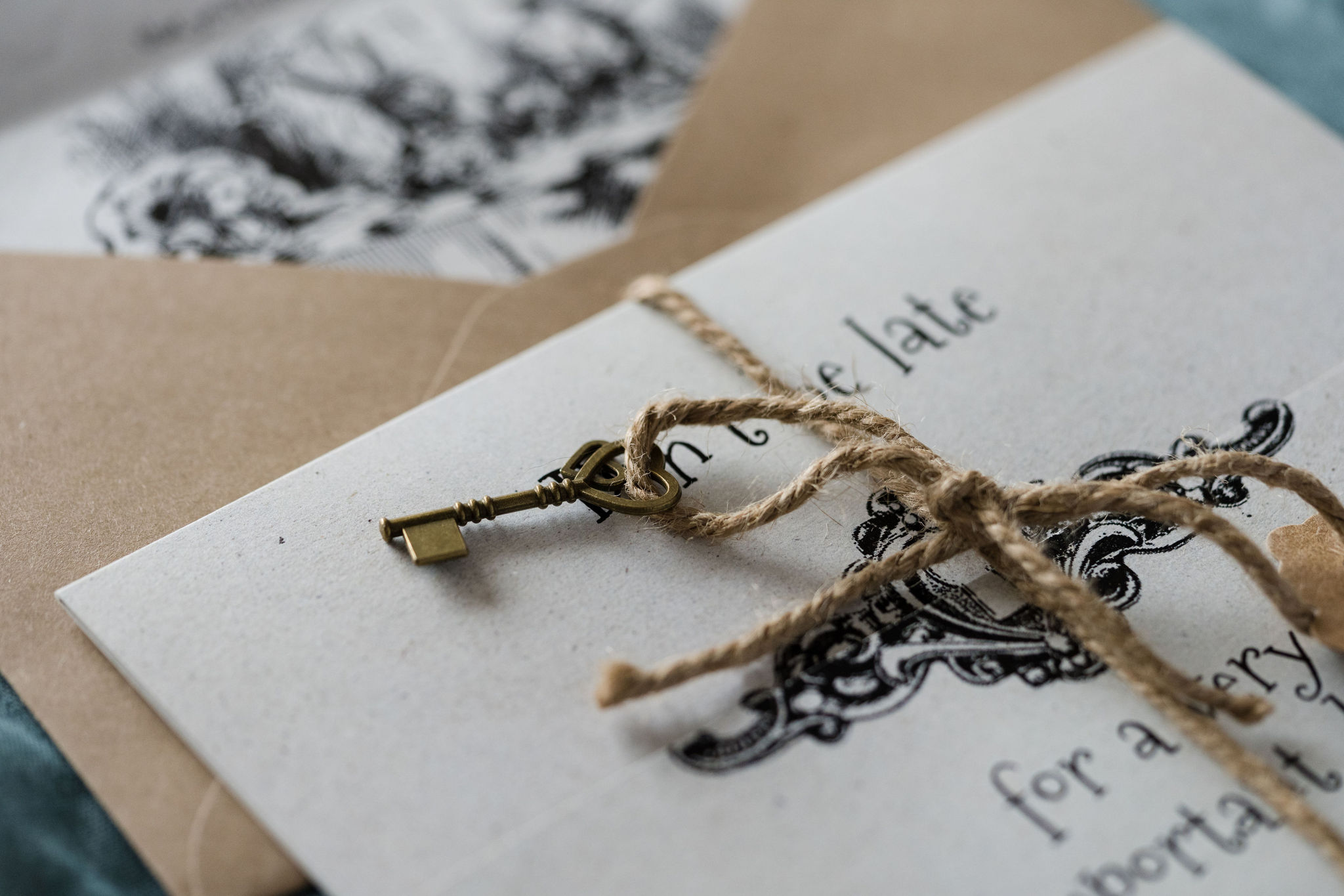 Mein Job bestand hauptsächlich darin, die passenden urheberrechtsfreien Illustrationen zu finden und mir ein Gesamtkonzept zu überlegen, wie die einzelnen Elemente zusammenspielen könnten. Gewünscht waren natürlich die Einladung, Kontaktinformation, Anfahrtsplan, Informationen zur Nächtigung und eine RSVP-Karte. Bei so vielen Einzelteilen muss natürlich alles zusammenpassen und trotzdem das Thema beibehalten werden. Wir entschieden uns für einen Folder im Altarfalz, zusammengebunden mit einem rustikalen Band und einem Schlüssel sowie handkalligraphierten Anhänger versehen. Beim Aufklappen kamen dann weitere Infos sowie die handlichen Zusatzkarten zum Vorschein. Diese waren in einer Größe konzipiert, die sich einfach auf die Reise zur Hochzeit mitnehmen lässt um den Weg und den Ablauf immer handlich dabei zu haben.