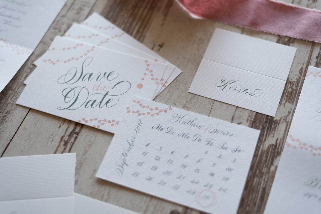 Bei Kathrin und Simons Hochzeit hat sich das Motiv der Lichterkette durch die gesamte Papeterie bis hin zur Hochzeitsdekoration gezogen. Während die Save the Date-Karten noch klassisch auf A6 waren, war die Einladung etwas besonderes: Sagenhafte 8 Seiten, zu einem süßen Leporello gefalzt, stimmten die Gäste schon auf einen romantischen Abend ein. Gedruckt auf starkem 100% Baumwollpapier von Gmund ist auch die Haptik ein Traum. Für den großen Tag selbst gab es dann noch passende Tischkärtchen und einen illustrierten Sitzplan. Für mich war die Zusammenarbeit mit diesem absolut lieben Paar toll, da sie mir viel Freiheit bei der Gestaltung ließen und ich mich wunderbar austoben konnte.