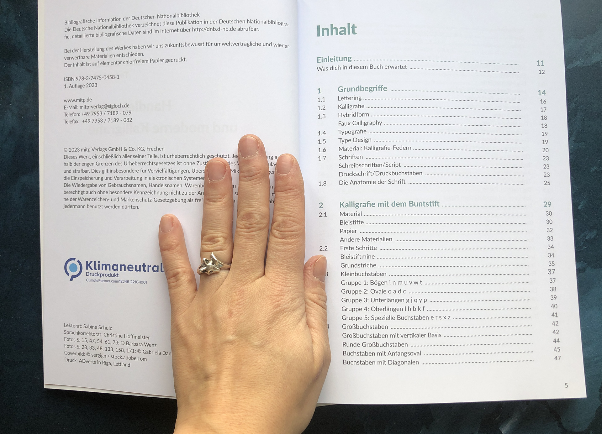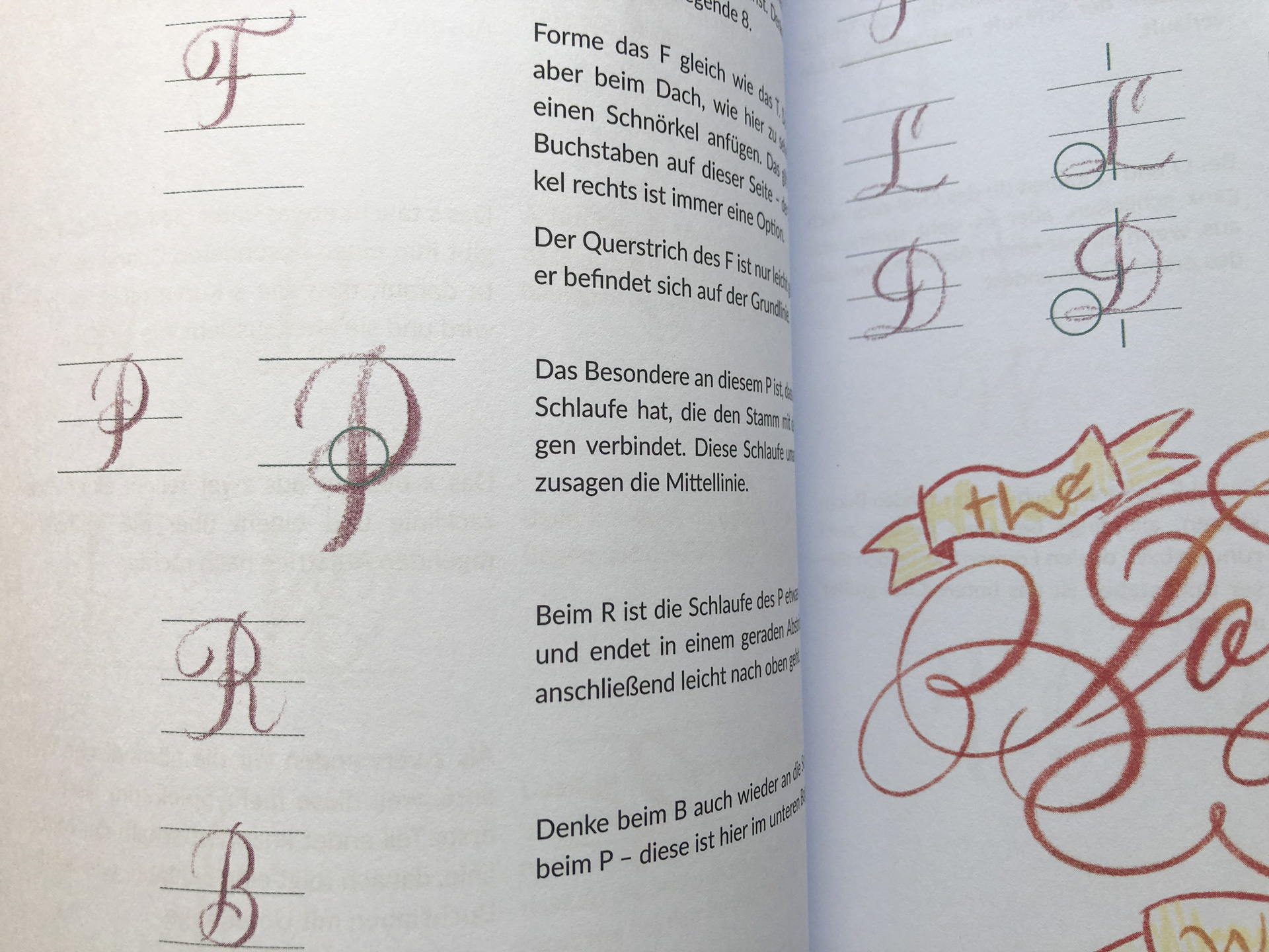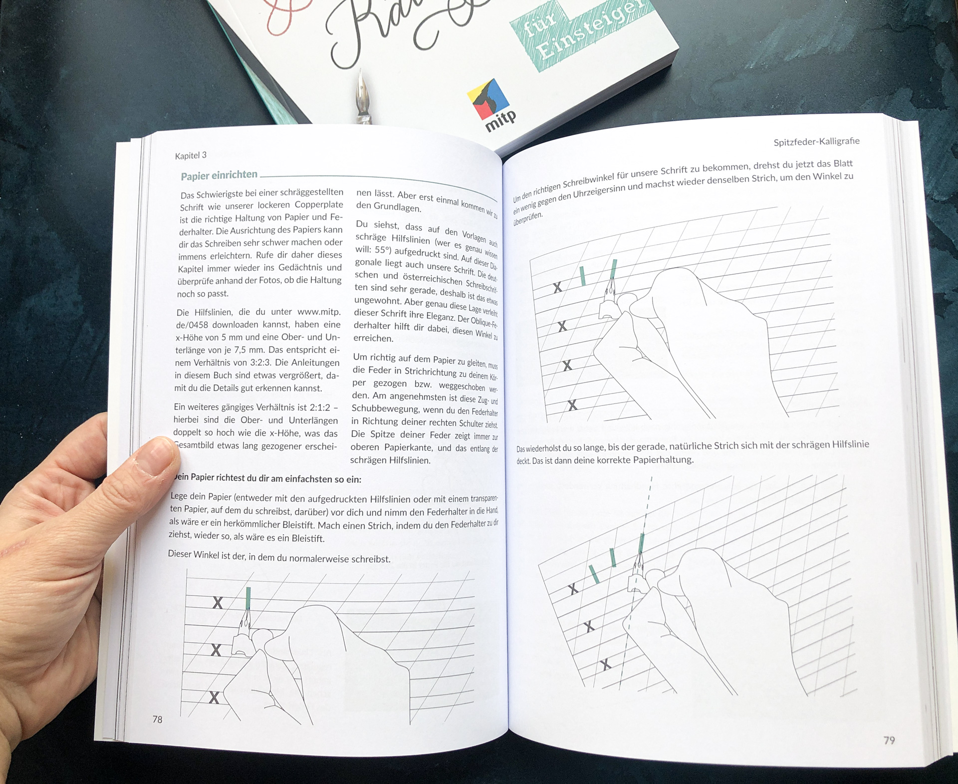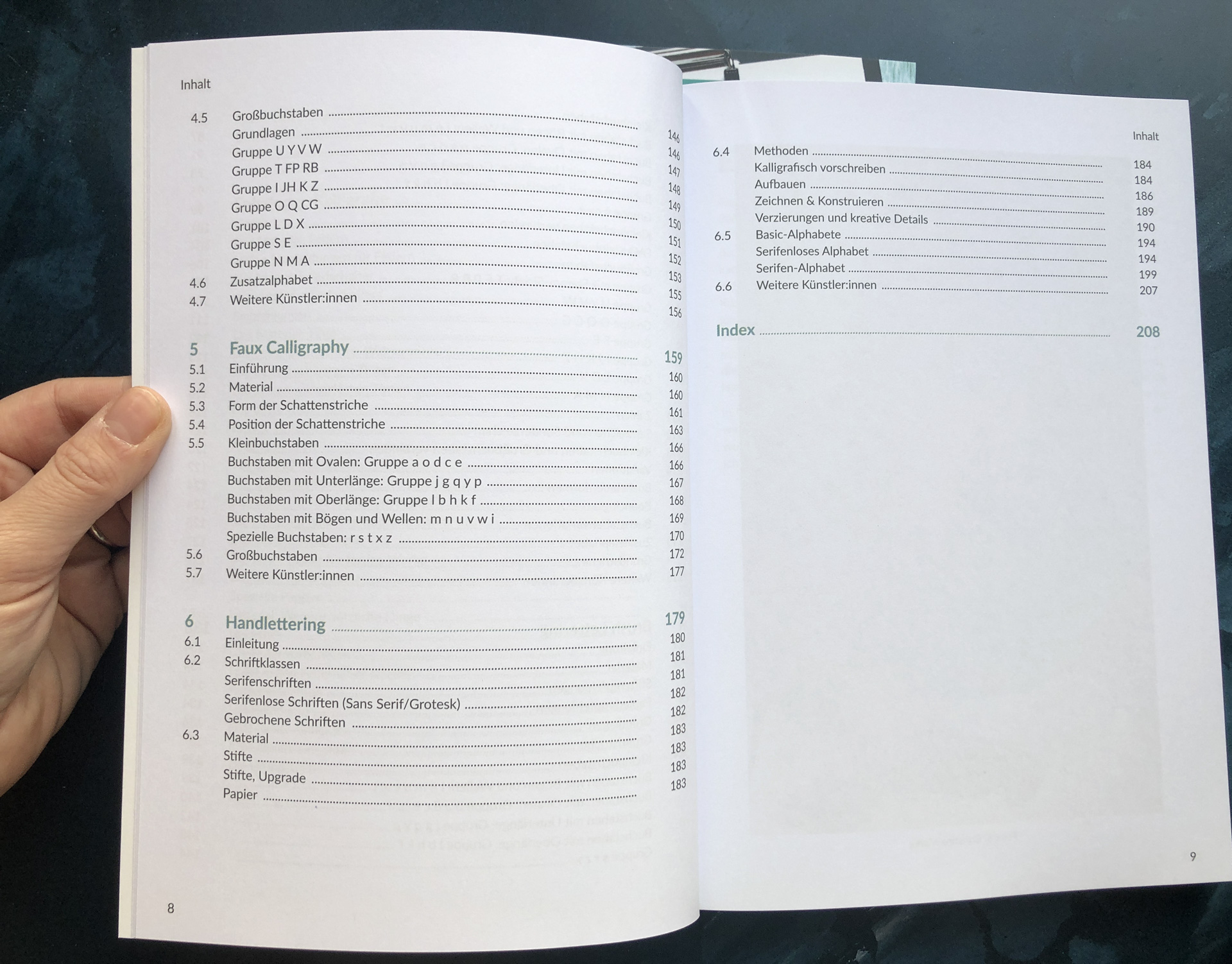 Ein großes Kapitel widmet sich meinem Lieblingsthema, der Spitzfeder-Kalligraphie. Dieses Kapitel ist eine neu bebilderte, ergänzte und überarbeitete Version des mittlerweile vergriffenen Buches „Moderne Kalligrafie von A bis Z“.