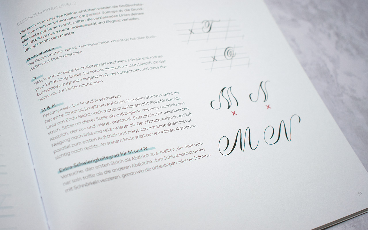 Mein Buch „moderne Kalligrafie von A bis Z“ ist leider vergriffen – es gibt aber noch das Übungsheft! Darin kannst du nach Herzenslust die Buchstaben üben, das Papier ist spitzfederfreundlich. Die Buchstaben werden ebenfalls noch einmal genau erläutert.