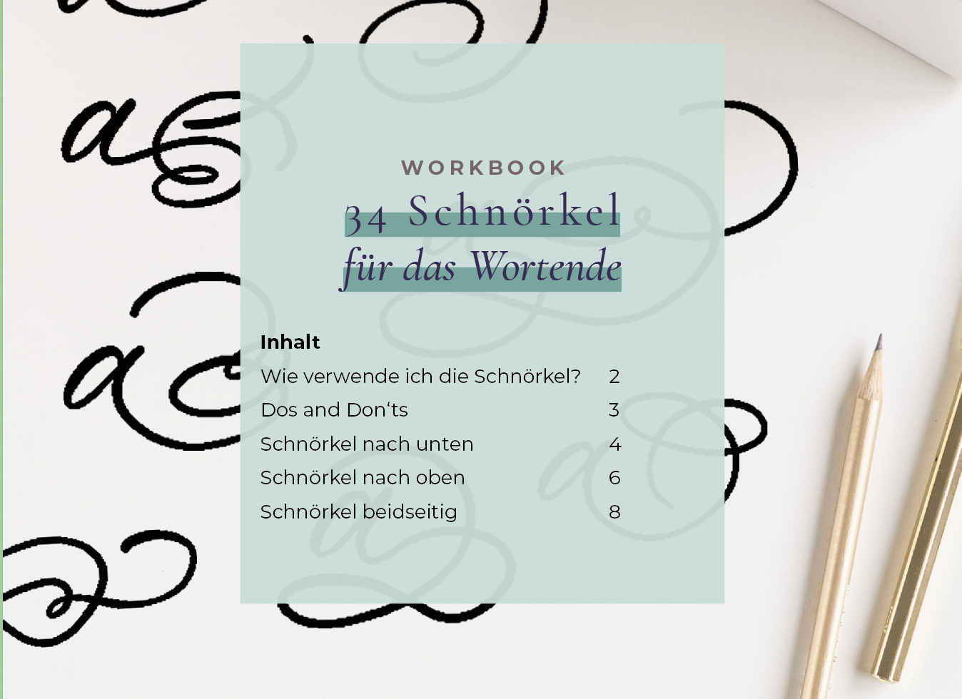 Dieses Schnörkel-Workbook Bundle beinhaltet alles was du brauchst um deinen Werken das gewisse Etwas zu verpassen. Schnörkel, Schnörkel, Schnörkel. Am besten sehen diese mit der Spitzfeder aus, aber auch mit Brush Pen, Bleistift, Buntstift, Gelstift oder Fineliner oder kannst du all die Anleitungen super umsetzen. Ob verschnörkelte Buchstaben oder Zierelemente, in diesem Bundle findest du alles von Vorlagen bis zu detaillierten Schritt-für-Schritt-Anleitungen.