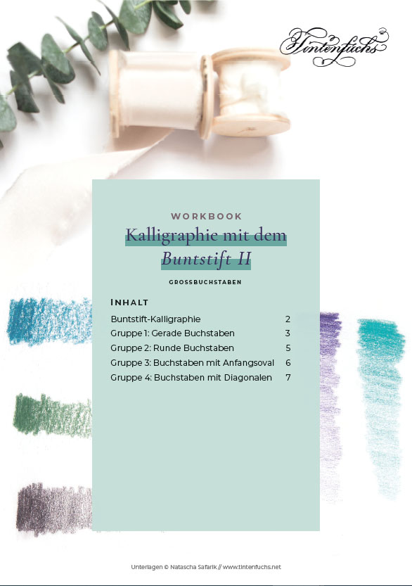 Dieses Workbook ist der zweite Teil zu Workbook: Buntstift-Kalligraphie I. Darin zeige ich dir, wie du mit ebendiesem oder einem Bleistift kalligraphierst- Großbuchstaben-Version.