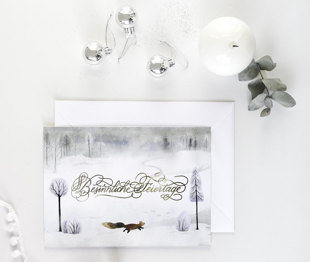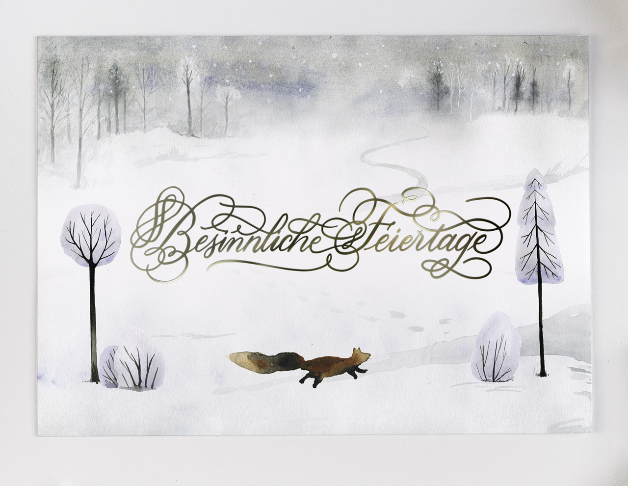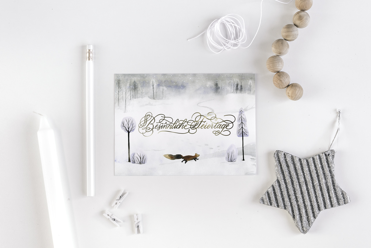 5 Stk. Weihnachtskarten mit Fuchs, Digitaldruck auf 300g Kunstdruckkarton mit der Schrift in schimmernder, erhabener Goldfolie.