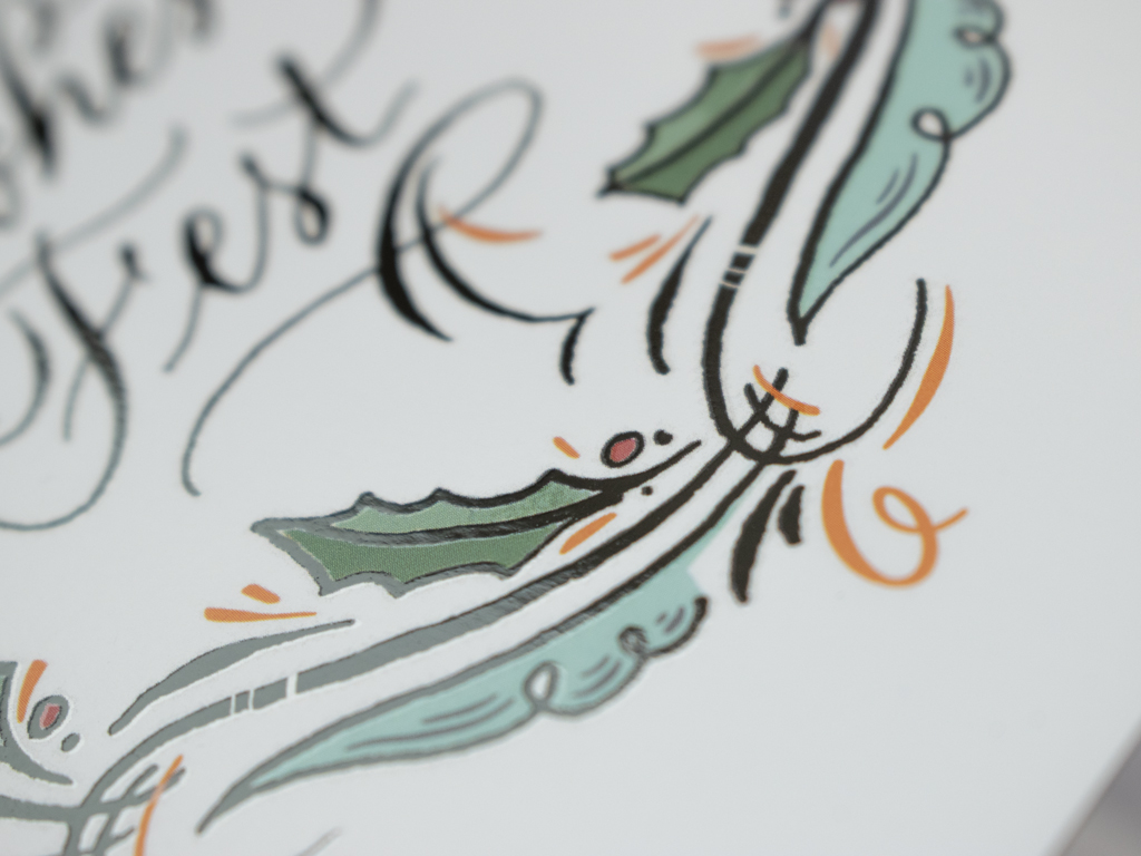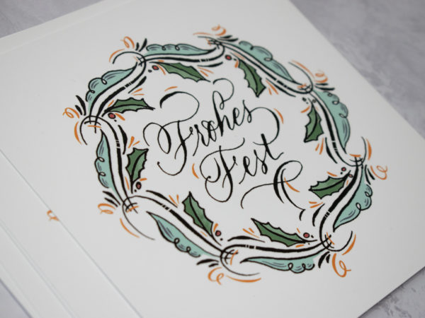5 Stk. Kalligraphie-Weihnachtskarten, Digitaldruck auf 300g Kunstdruckkarton mit Spot-Lack am Kranz und Text. <3