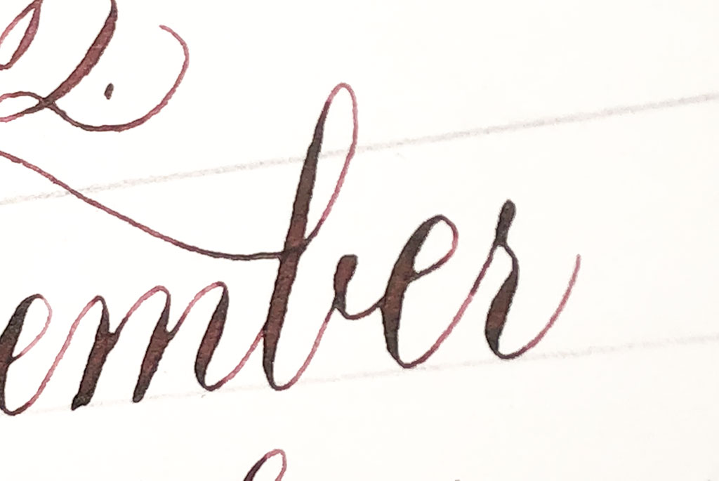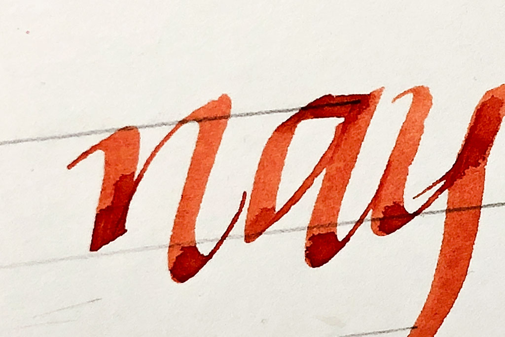Die Oberfläche ist, wie erwartet, sehr glatt. Es gibt trotzdem minimalen Widerstand, so dass man noch genug Kontrolle über die Feder hat und diese trotzdem sehr schön über das Papier gleitet. So kann man sehr gut Strichstärken variieren. Ein tolles Gefühl!